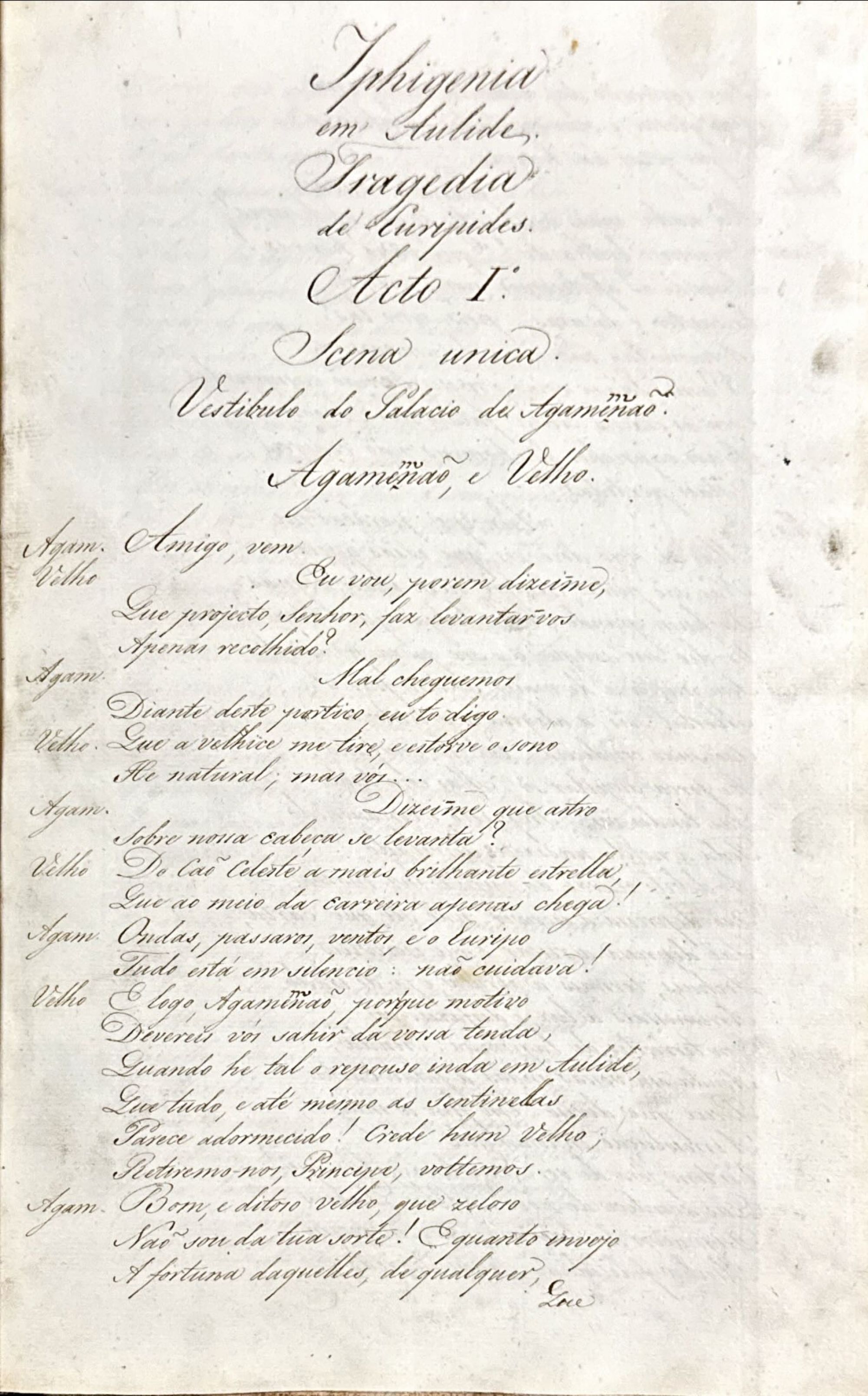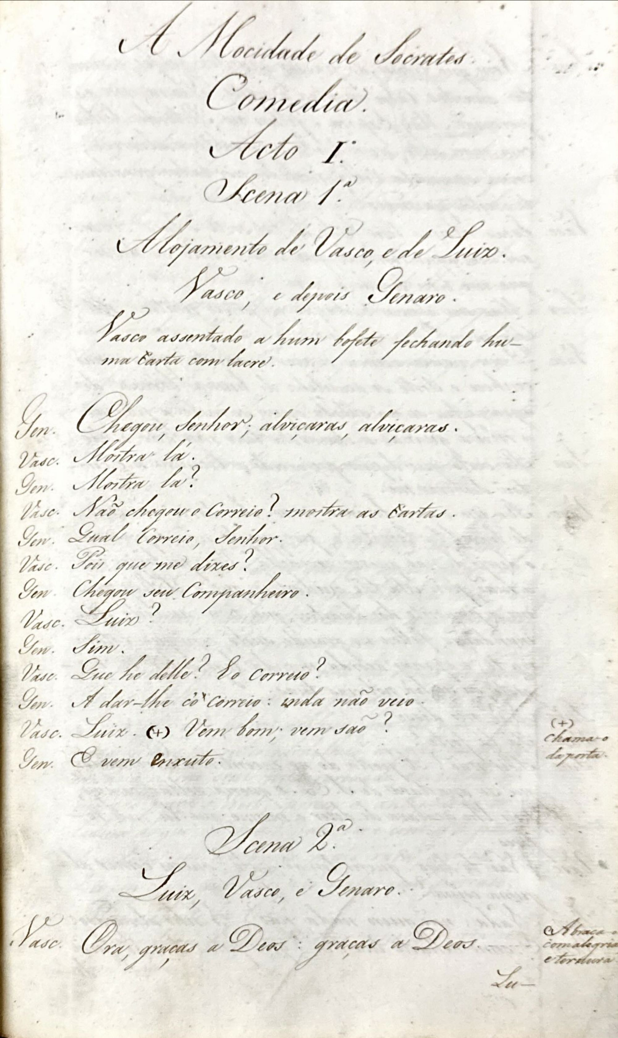 MANUSCRITO. - PEÇAS DE TEATRO. Manuscrito de 1776 que reúne as seguintes peças: "Lucia ou a Hespanhola", tragedia de D. Gabriel Triaquero; "Iphigenia em Aulide", tragedia de Euripedes; "A Mocidade de Socrates", comedia de Manuel de Figueiredo. "Ifigénia". 1776 (a1777). As 4 obras. In-fólio de . Encs em 1