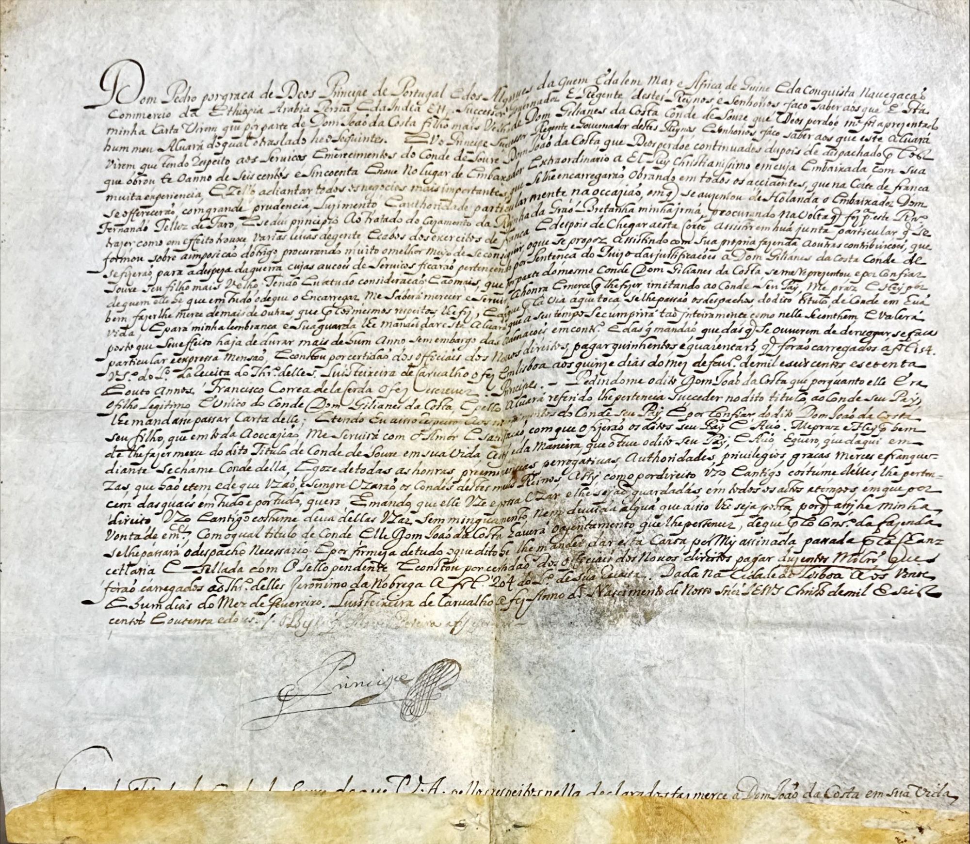 Carta de concessão do título ao 3º conde de Soure, assinada pelo Príncipe D. Pedro, que lembra os serviços do 1º e dos 2º condes, seus pai e avô. O 1º Conde de Soure, D. João da Costa foi nomeado por D. João IV em 1652. Foi um dos conjurados de 1640, serviu em Tânger, combateu na Guerra da Restauração e foi membro do Conselho de Guerra, destacando-se como figura crucial na aclamação do rei.