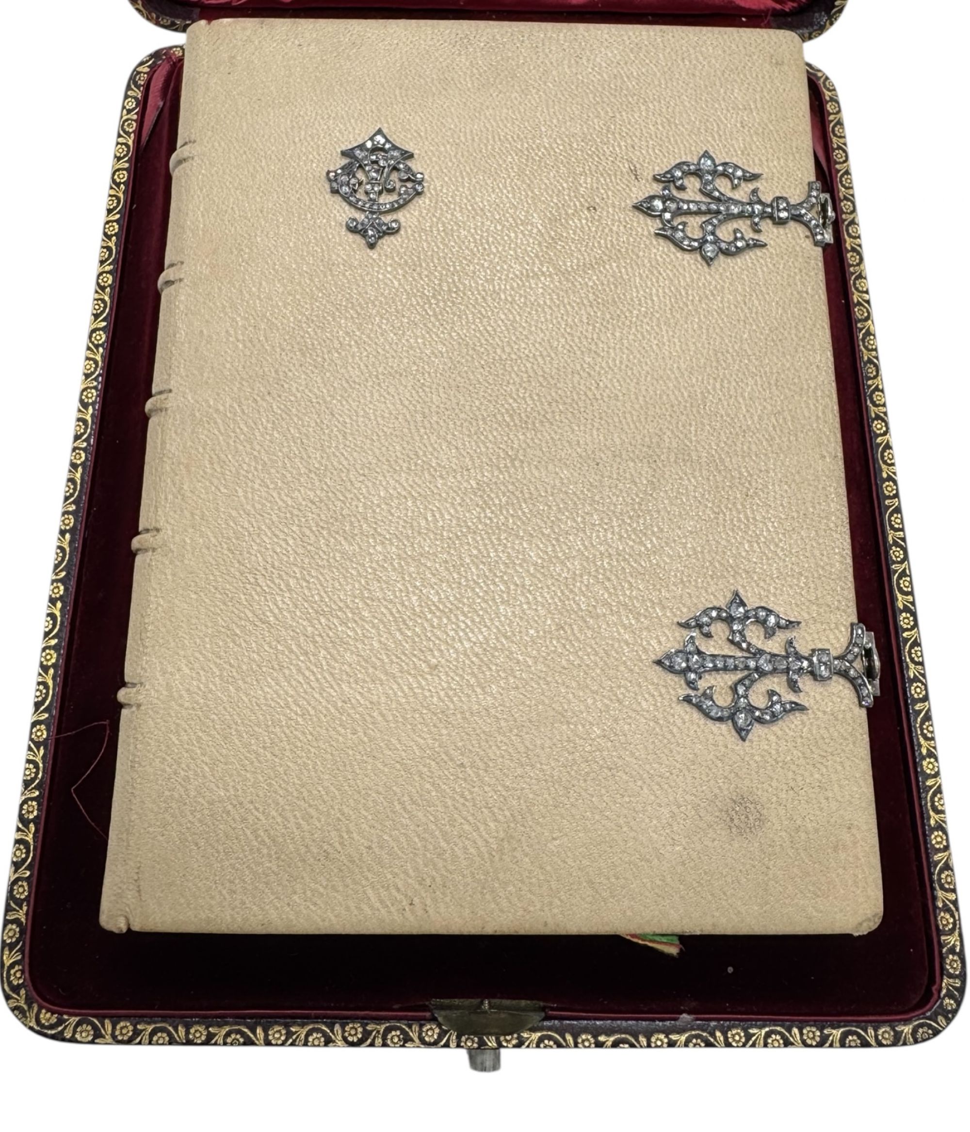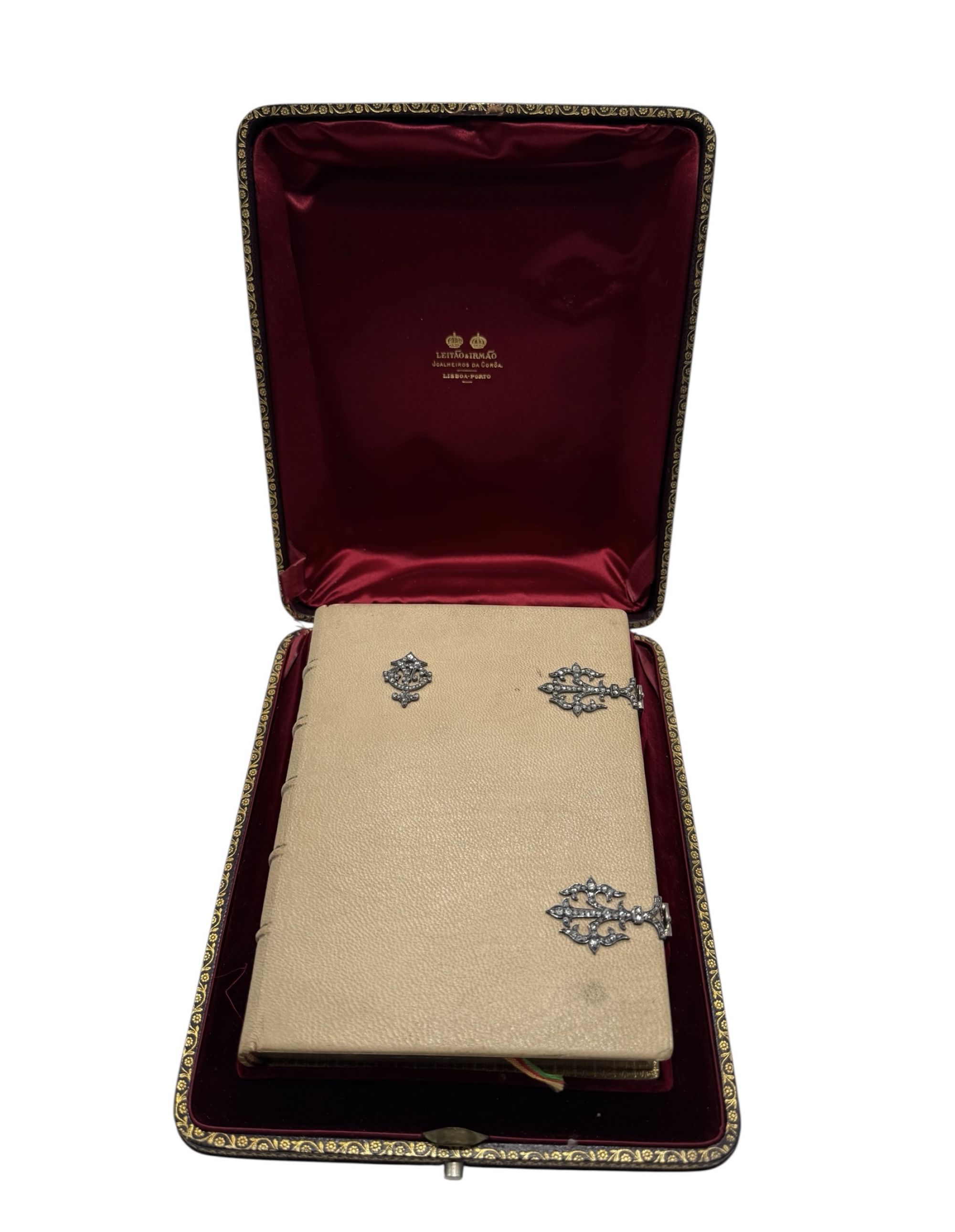 Encadernação Leitão & Irmão, joalheiros da coroa em inteira pele, com fechos e aplicações na pasta da frente em prata e brilhantes, guardas em seda e seixas em ouro. Acondicionado em estojo próprio do Joalheiro. Dourado por folhas.