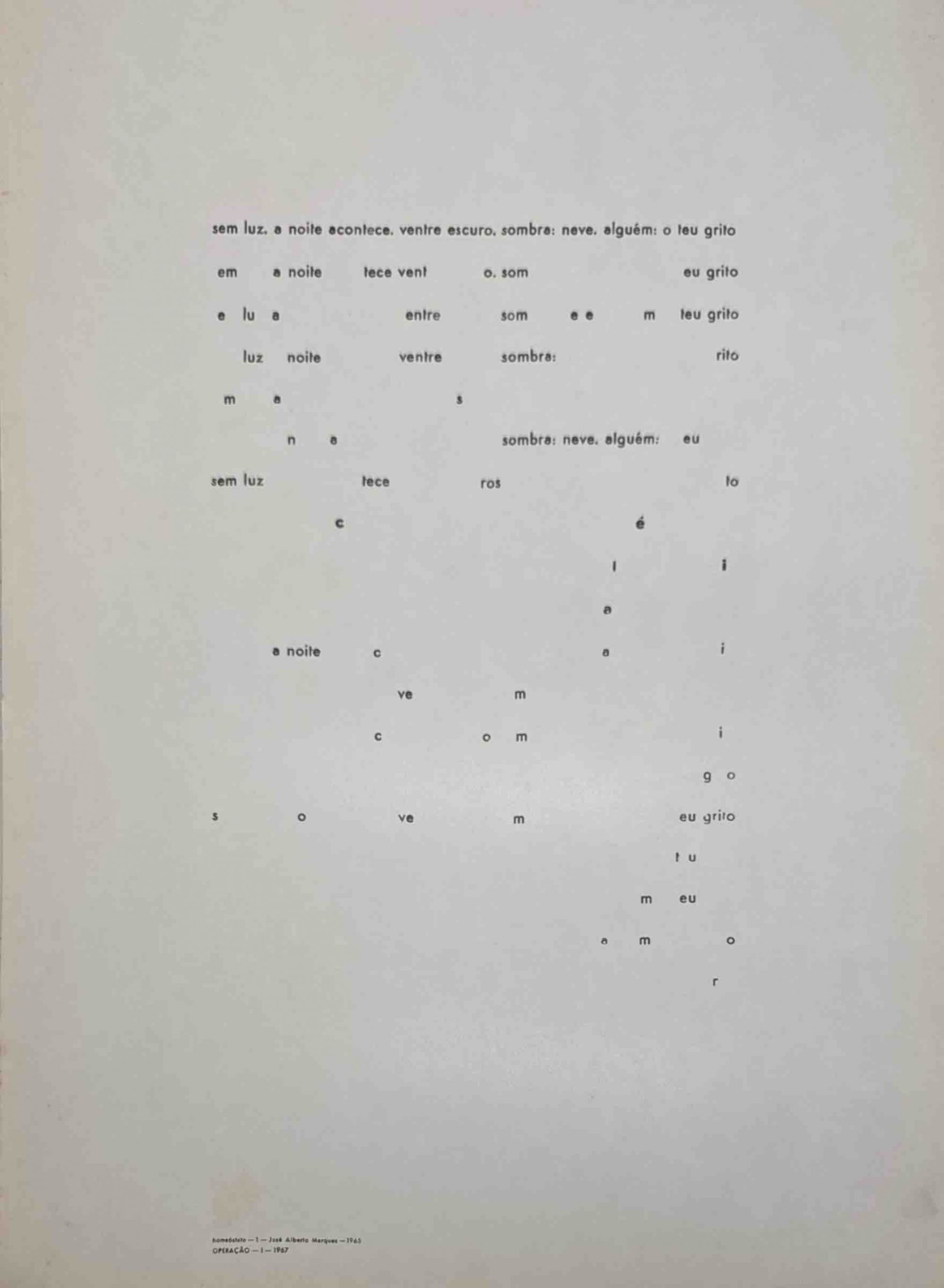 Raro e original trabalho, com cartazes de António Aragão, Alfabeto Estrutural de Ana Hatherly; 10 sintagmas de E. M. de Melo e Castro; 9 homeóstatos de José Alberto Marques; 4 epithalamia de Pedro Xisto. Capa de João Vieira. Acondicionado Numa caixa própria. Defeito no canto da pasta.