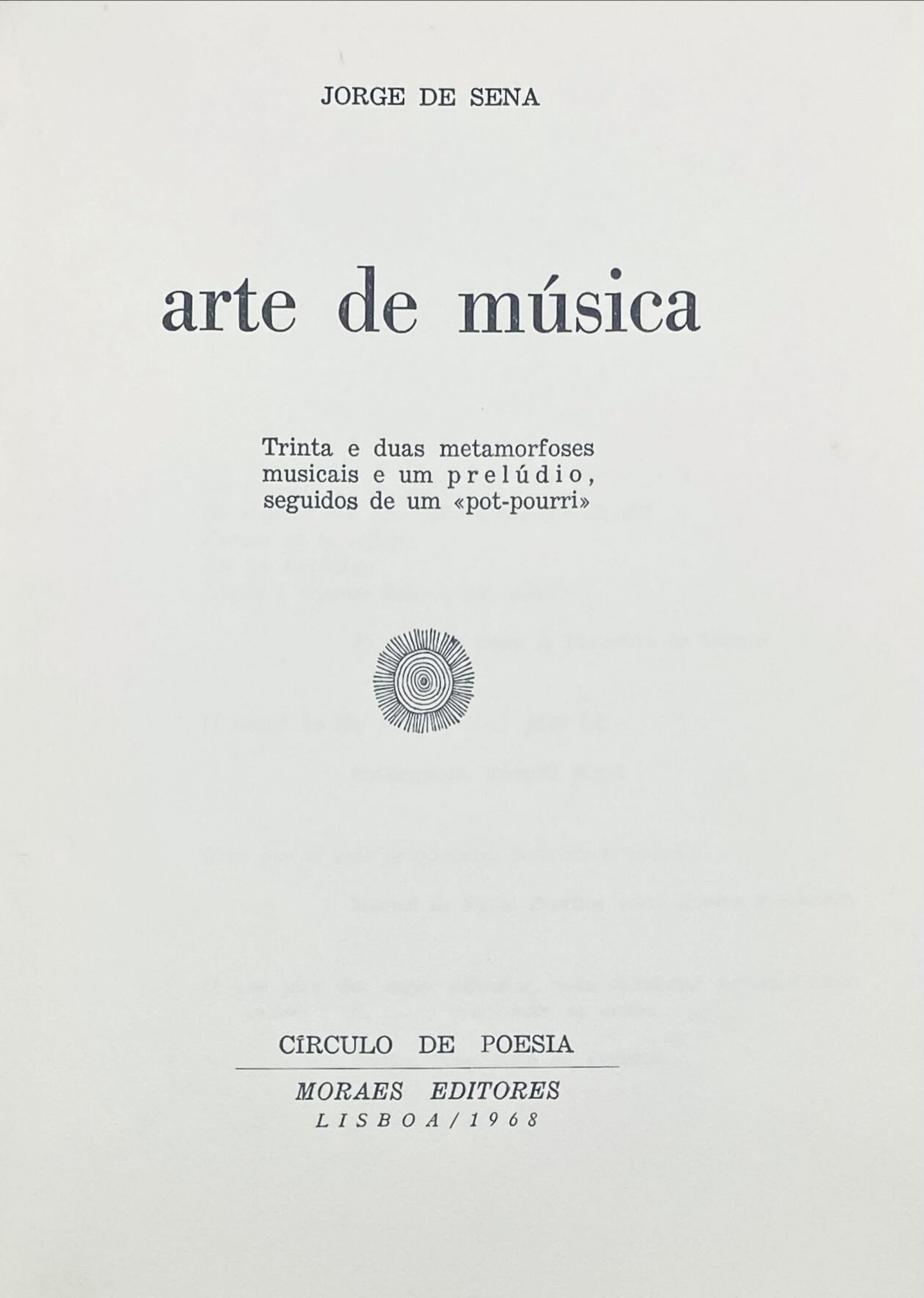 SENA, Jorge de. - ARTE DE MÚSICA. Trinta e duas metamorfoses musicais e um prelúdio, seguidos de um "pot-pourri". Lisboa. Moraes Editores. 1968. In-8º de 102, [6] págs. Enc.