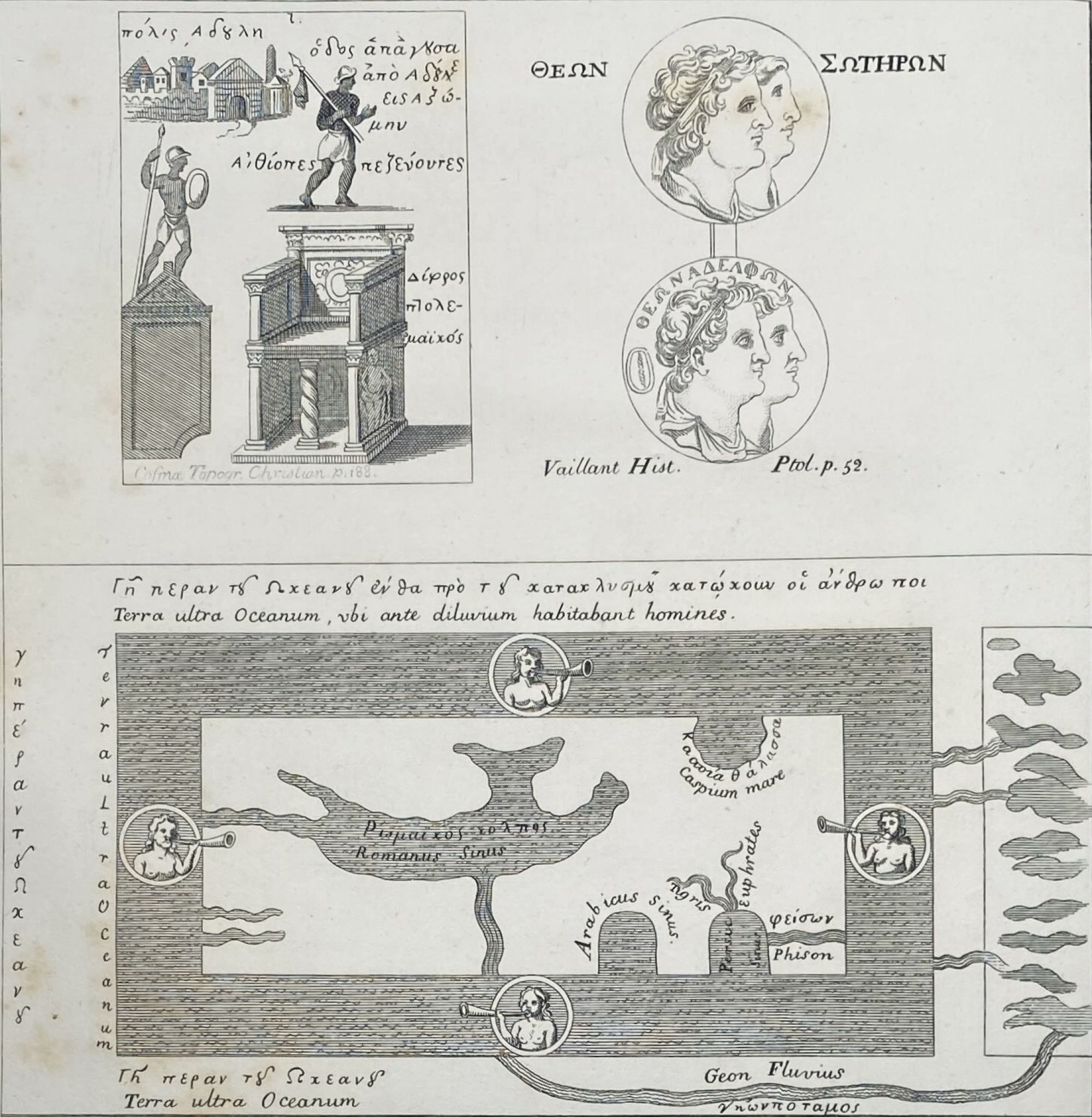 Primeira edição desta rara geografia do Médio Oriente, publicada em duas partes: 1. Do Mar de Suez à Costa de Zanguebar; 2. Do Golfo de Elana, no Mar Vermelho, até a Ilha do Ceilão. Inclui uma extensa discussão sobre a Península Arábica, incluindo seções sobre Myos Hormus, a Riqueza da Arábia, a Costa do Iêmen, Aden, Mokha e Omã, Comércio Oriental pelo Golfo, etc., um mapa do Mar Vermelho e o famoso mapa mundial de al-Idrisi, "um pináculo da cartografia medieval, bem como da história da pesquisa geográfica". Ilustrado com um retrato de Vasco da gama junto ao frontispício do primeiro volume, 6 mapas em folhas desdobráveis, uma gravura e um mapa. Encadernação da época inglesa em inteira de pele, com ferros a ouro na lombada e pastas. Corte marmoreado de folhas.
